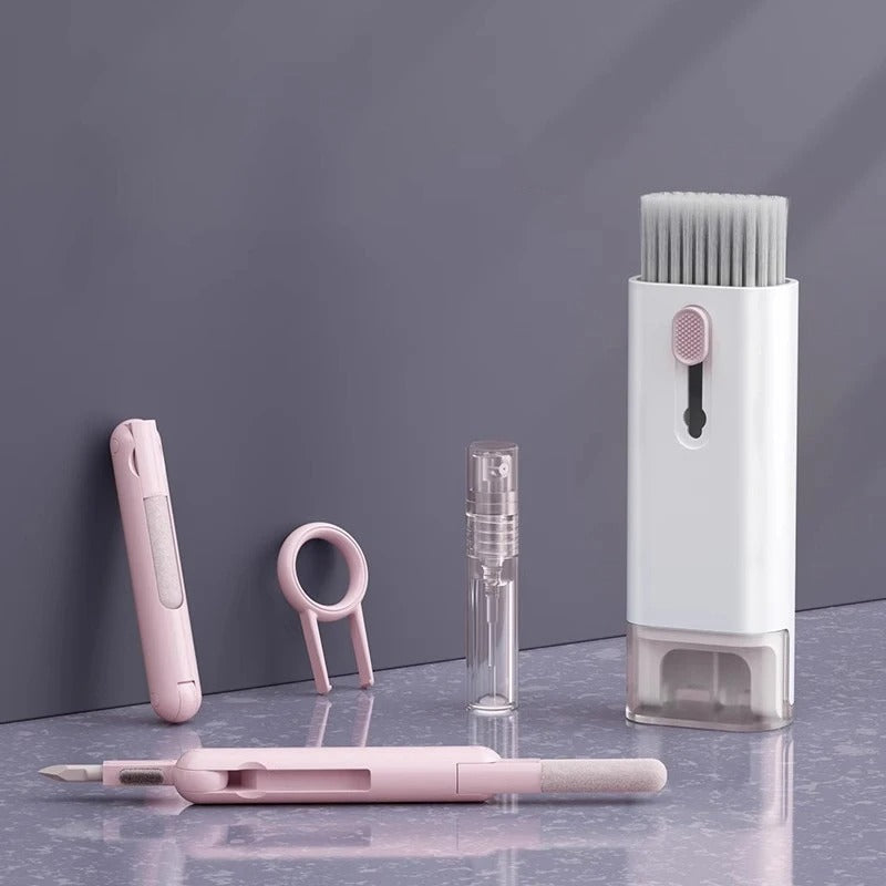 -7 in 1 Multifunctional Cleaner Kit: The electronic cleaning kit includes a cleaning pen for Airpods with silicone nip, mini brush and flocking sponge brush; high-density soft brush, cleaning spray bottle(empty), fiber fleece swipe and keycap buckle. The kits can clean headphones, keyboards, PC monitors, phones, cameras etc.
